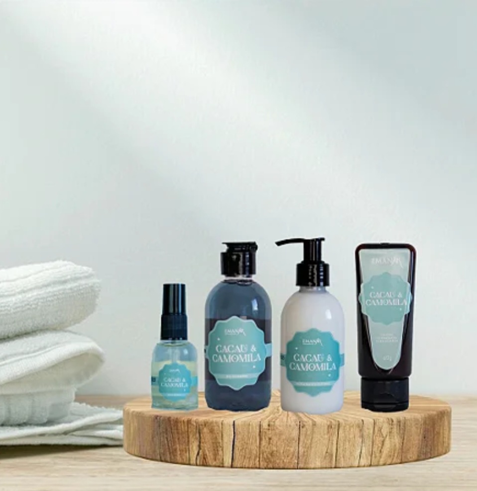 A linha Cacau e Camomila inspirada em duas plantas, associa o Cacau pela sua força frente às adversidades e a Camomila pela força que reside na sua calmaria e raridade do óleo essencial. Este combo traz em sua essência a harmonia e a liberdade. A junção destes dois elementos em uma linha, nos motiva a sermos resistentes, livres e harmônicos. É um convite a um mergulho no autocuidado e no autoconhecimento com uma combinação perfeita dos compostos aromáticos da polpa do cacau com o óleo essencial de Camomila numa fragância fresca e envolvente. Venha Emanar autocuidado....